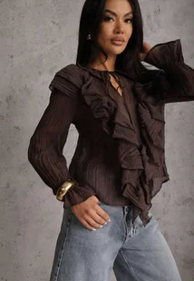 Brązowa Bluzka z Lyocellem Ozdobiona Falbanami i Wiązaniem Esathra