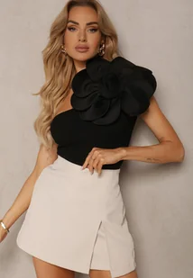 Czarna Bawełniana Bluzka z Asymetryczną Górą i Dużą Aplikacją w Kształcie Kwiatka Pereria