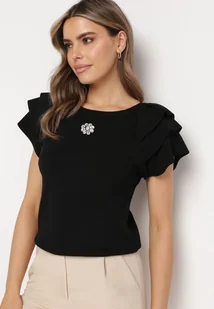 Czarna Bluzka z Falbankowymi Rękawami i Broszką z Cyrkonii Julietts