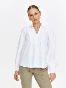 Biała koszula z kołnierzem i dekoltem w serek to elegancka, ale zarazem wygodna opcja na wiele okazji. Model wykonany jest z wysokiej jakości bawełny, która zapewnia przewiewność i komfort noszenia. Marszczenie przy dekolcie nadają koszuli nowoczesnego charakteru.