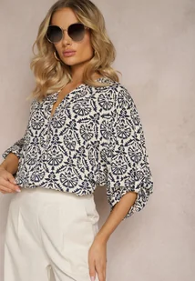 Biało-Granatowa Bluzka z Wiskozy z Rękawem 3/4 i Ornamentalnym Wzorem Belloma