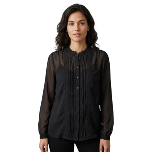 Design i detale: Pionowe wstawki z gipiury biegnące wzdłuż przodu, dodające koszuli luksusowego charakteru. Eleganckie plisowania przy zapięciu, które optycznie wysmuklają sylwetkę. Stójka wykończona koronką, tworząca subtelny, biżuteryjny efekt przy szyi. Zapinana na małe, dopasowane kolorystycznie guziczki.