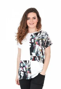 Lekka tunika wykonana z elastycznej, wiskozowej dzianiny, z fantazyjnym nadrukiem - kolażem zdjęć. Przyjemna, miękka i chłodna w dotyku. Luźniejszy fason zapewnia doskonały komfort noszenia. Krój kimono dla kobiet lubiących proste niezobowiązujące fasony. Dzięki szerokiemu zastosowaniu, ubiór można komponować w dowolnej stylizacji.