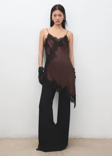 Satynowa tkanina, Dopasowany krój, Asymetryczny krój, Koronkowe elementy, Dekolt w serek, Bez rękawów, Cienkie ramiączka, Bez zapięcia