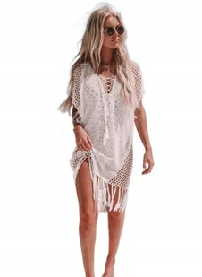 PAREO AŻUROWE NARZUTKA NA STRÓJ TUNIKA BOHO BIAŁA FRĘDZLE KRÓTKI RĘKAW