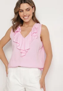 Różowa Bluzka z Wiskozą Zdobiona Falbaną przy Dekolcie Palissea