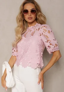 Różowa Bluzka ze Stójką z Ażurowej Koronki Nariras