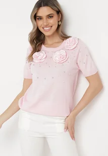 Różowa Wiskozowa Bluzka z Perełkami Cyrkoniami i Aplikacjami Kwiatków Tessia