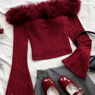 TEMU Bordowy Pluszowy Top z Odkrytymi Ramionami i Rozkloszowanymi Rękawami