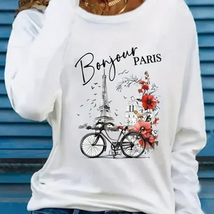 TEMU Damska koszulka z długim rękawem z nadrukiem Paryża - z żywym i kwiatowym motywem rowerem, wykonana z miękkiej i oddychającej tkaniny. Ta luźna