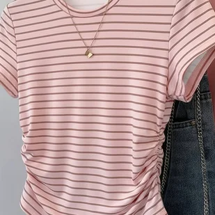 TEMU Damska koszulka z krótkim rękawem w paski, nowy letni styl, dopasowany crop top dla modnego wyglądu