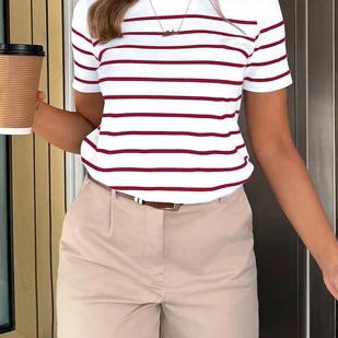 TEMU Prosta koszulka z krótkim rękawem i okrągłym dekoltem, w klasycznym biało-czerwonym wzorze w paski, oddając swobodny i stylowy nastrój.