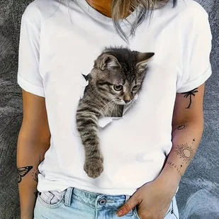 TEMU Urocza i Zabawowa Kotka! Biała Koszulka z 3D Wyciętym Wzorem Kociaka, Luźny Krój dla Miękkiego i Słodkiego Klimatu, Bez Wysiłku Przekazująca