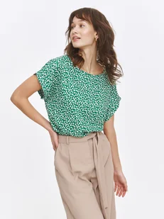 Bluzka damska Top Secret z delikatnym nadrukiem w małe kwiaty. Przepełniona niecodziennym wdziękiem oraz ceniona za wiele możliwości praktycznego zastosowania, bluzka damska o pełnym luzu oraz swobody fasonie, z krótkim rękawem w formie kimono zakończonym przeszyciem. Posiada ona okazały okrągły dekolt z delikatną lamówką wokół, będąc wykonaną z przyjemnej w dotyku oraz przewiewnej tkaniny wiskozowej. Dużego uroku dodaje jej efektowny nadruk na całości w małe kwiaty, sprawiając, iż może być ona z dużym powodzeniem wykorzystywana zarówno jako element niecodziennej stylizacji do pracy, jak i też podczas weekendu. Bluzka damska dostępna w kolorze zielonym TSKS25BLK301077X00.