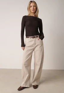 Beżowe Jeansy z Bawełny Typu Balloon High Waist Ozdobione Przeszyciami Eunaris