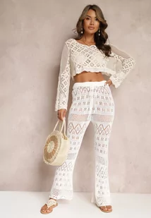 Białe Ażurowe Spodnie Flare ze Sznurkiem i Gumką w Talii Alinata