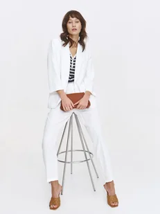 Spodnie damskie dostępne w kolorze białym TSKS25SPO455600X00. Modelka ma 177 cm wzrostu i prezentuje rozmiar 34.