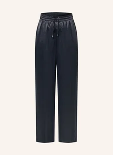 Wysoki stan. Szerokie, proste nogawki. Elastyczny pas w talii z tunelem z troczkiem. Kanty. Boczne kieszenie wpuszczane. Materiał gładki w dotyku. Materiał satynowy