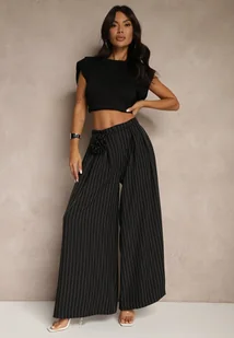 Czarne Spodnie Palazzo High Waist Ozdobione Broszką Kwiatem Folassea