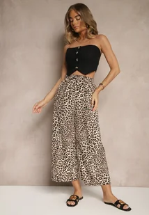 Czarno-Beżowe Spodnie Wide Leg z Gumką w Talii w Panterkowy Wzór Filanira