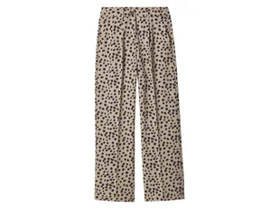 esmara® Spodnie damskie z szerokimi nogawkami Opis produktu Wyprodukowano z materiałów pochodzących z recyklingu Wyjątkowo miękkie i przyjemne w dotyku dzięki wiskozie Z kieszeniami wpuszczanymi i imitacjami kieszeni z tyłu Z wysokim stanem Szerokie nogawki z kantem Z wysokiej jakości zamkiem błyskawicznym marki YKK z recyklingu Optymalne dopasowanie dzięki elastanowi Lycra® Cechy produktu table{width:100%;}td{padding-right: 30px; padding: 0.5rem; border-bottom: 0.0625rem solid #e3e4e5;} tr: nth-child(odd) {background-color: #F2F3F4;} Kolor: beżowy; w panterkę; czarny Wzór: w panterkę: nadruk na całej powierzchni Szczegóły: