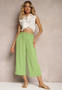 Jasnozielone Szerokie Spodnie z Wysokim Stanem z Gumką w Talii i Nogawkami Długości 3/4 Levolia