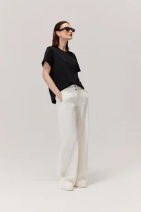 Wyposażone w boczne kieszenie, jeansy są nie tylko stylowe, ale także bardzo praktyczne. Bez kieszeni na pośladkach, by wyglądały bardziej elegancko. Cechy: Wykonane z lekkiego materiału, te jeansy są idealne na letnie dni, zapewniając nie tylko stylowy wygląd, ale także wygodę noszenia. Szeroka nogawka i minimalistyczny design sprawiają, że jeansy są doskonałym wyborem dla osób ceniących sobie prostotę i elegancję w każdej sytuacji. Dzięki swojemu klasycznemu designowi, jeansy z łatwością dopasują się do różnych stylizacji, pozwalając Ci wyrazić swój niepowtarzalny styl i osobowość.