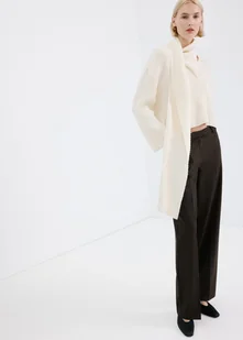 Design długi, Krój wide leg, Średni stan, Detal z zakładkami, Szlufki, Dwie boczne kieszenie, Zapięcie z przodu na guzik, haftkę i zamek kryte pod listwą, Podszewka wewnętrzna