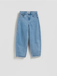 Jeansy o kroju barrel leg, wykonane z bawełnianej tkaniny.