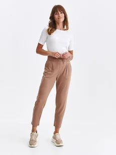 Spodnie damskie Top Secret joggersy z podwyższonym stanem. Cenione za komfort podczas użytkowania oraz pełen swobody styl spodnie damskie joggersy z prostymi zwężanymi nogawkami o długości do kostek, zakończone delikatnym przeszyciem. Posiadają one podwyższony stan oraz szeroką praktyczną gumkę w talii wraz z efektownym wiązaniem z wykorzystaniem cienkiego sznurka z przodu, a uroku dodają im praktyczne kieszenie po bokach oraz również małe kieszenie z tyłu. Zostały one wykonane z przyjemnej w dotyku oraz dobrej gatunkowo dzianiny, sprawdzając się w przeróżnych kobiecych stylizacjach casualowych w okresie letnim i wiosennym. Spodnie dostępne w kolorze beżowym SSP4475BE.