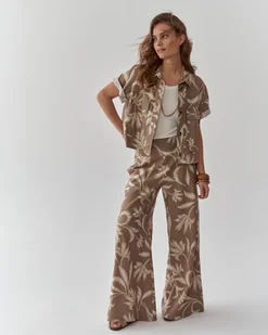 Przemierzaj lato w wielkim stylu w modelu Hadar. Te spodnie to połączenie modnego wzornictwa i wyjątkowej wygody, idealne na ciepłe dni. Ich brązowy kolor z białymi, roślinnymi motywami przykuwa wzrok i nie pozwala być obojętnym. Fason dzwonów wydłuża nogi, tworząc efektownie zbalansowaną sylwetkę. Wysoki stan spodni pięknie podkreśla talię i wysmukla sylwetkę, dodając klasy każdej stylizacji.
