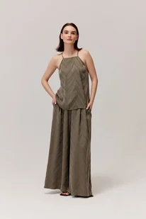 Najważniejsze cechy spodni: Kolor: Stonowany odcień oliwki, podkreślający naturalny charakter tkaniny. Faktura materiału o unikalnym wzorze w jodełkę ("Herringbone"), dodająca głębi i wyrafinowanego charakteru. Subtelny połysk materiału podkreśla jego wysoką jakość. Krój: Spodnie palazzo z wysokim stanem i pięknie układającymi się szerokimi nogawkami.