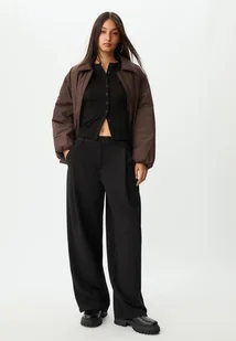 Eleganckie spodnie ze średnim stanem i szlufkami w pasie. Boczne kieszenie i imitacje kieszeni z wypustką z tyłu. Z przodu zaszewki. Szeroka, prosta nogawka. Zapięcie z przodu na zamek błyskawiczny i guzik.