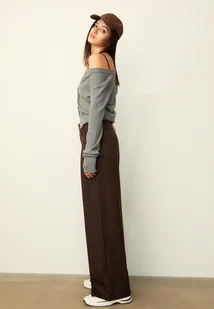 Spodnie wizytowe ze średnim stanem i szerokim pasem ze szlufkami. Detal w postaci dużych zakładek z przodu. Szerokie, proste nogawki. Zapięcie z przodu na zamek błyskawiczny, wewnętrzny guzik i metalowe elementy.