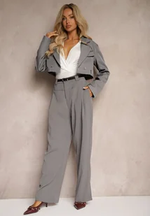 Szare Szerokie Spodnie Garniturowe z Gumką w Talii Ozdobione Paskiem Verillias