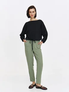 Klasyczne, jasnozielone spodnie wykonane z lekkiej, zwiewnej tkaniny o prostym fasonie. Model posiada wyższy stan oraz elastyczną gumę w pasie, która zapewnia doskonałe dopasowanie oraz komfort noszenia. Po bokach znajdują się głębokie kieszenie, które nadają spodniom luźnego, casualowego charakteru.