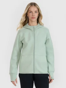 Bluza z kapturem 4F damska - CECHY: zakres rozmiarów XS-XXL – szeroka rozmiarówka umożliwia idealne dopasowanie wnętrze bez podszycia – lekka konstrukcja zapewniająca wygodę noszenia krój slim – podkreśla sylwetkę i zapewnia nowoczesny wygląd standardowy fason do bioder – uniwersalna długość pasująca do różnych stylizacji materiał syntetyczny – trwały i łatwy w pielęgnacji 32% wiskozy – miękkość, lekkość i zwiewność gwarantujące komfort i eleganckie układanie się materiału jednolita kolorystyka – wszechstronność w komponowaniu zestawów odzieżowych miękka, elastyczna dzianina interlock – przyjemna w dotyku i dopasowująca się do ciała dekolt ze zintegrowanym kapturem – dodatkowa ochrona i sportowy charakter mankiety ze ściągaczem i otworami na kciuk – komfort podczas aktywności napis na plecach "Everyday Pace" – subtelny detal podkreślający sportowy styl 2 otwarte kieszenie boczne – praktyczne rozwiązanie do przechowywania codziennych przedmiotów zapinana na jednokierunkowy zamek – łatwość zakładania i wygoda regulacji Bluza dresowa damska rozpinana z kapturem idealnie sprawdzi się jako element zarówno casualowych, jak i sportowych stylizacji na co dzień. Posiada dopasowany krój slim, który przylega do ciała. Dzianina o splocie interlock jest miękka oraz posiada gładką w dotyku powierzchnię. Dzięki wysokiej elastyczności włókien, dzianina interlock jest bardzo wygodna w noszeniu i idealnie dopasowuje się do sylwetki.