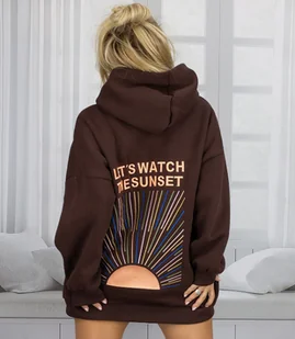 Luźny, swobodny krój – idealny na co dzień i do domowego relaksu Długość przed kolano – można nosić jako bluzę lub krótką sukienkę dresową Okrągły dekolt i obszerny kaptur dla większego komfortu Miękki, przyjemny w dotyku materiał zapewniający wygodę przez cały dzień Efektowny haft na plecach z napisem „LET'S WATCH THE SUNSET” Model unisex – świetnie podkreśla kobiecą i zarówno męską sylwetkę w sportowym wydaniu Bez zapięcia – bluza swobodnie wkładana przez głowę Damska bluza z kapturem przed kolano to must have w szafie każdej kobiety, która ceni komfort i modny, miejski styl. Luźny fason pięknie układa się na sylwetce, a długość pozwala nosić ją zarówno do legginsów, jak i solo, jak sukienkę dresową. Okrągły dekolt i obszerny kaptur dodają stylu oraz chronią w chłodniejsze dni. Tył bluzy zdobi wyjątkowy haftowany motyw zachodu słońca z napisem „LET'S WATCH THE SUNSET”, który przyciąga wzrok i nadaje całości niepowtarzalnego charakteru. Miękki materiał zapewnia wygodę podczas spaceru, podróży czy weekendowego odpoczynku.