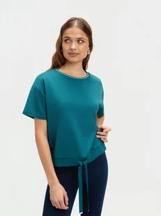 Ta turkusowa bluza z krótkim rękawem to idealny wybór dla osób ceniących połączenie stylu i komfortu. Wykonana jest z wysokiej jakości mieszanki materiałów co zapewnia elastyczność i wygodę noszenia. Doskonała na co dzień, świetnie sprawdzi się w casualowych stylizacjach. Modelka ma 177 cm. wzrostu i prezentuje rozmiar 36.