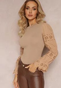 Beżowy Sweter z Ozdobnym Haftem i Ażurowym Rękawem Anulika