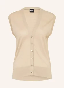 Bez rękawów. Prosty krój. Dekolt w serek. Z domieszką wełny ze strzyży. Jednolity kolor. Prążkowane ściągacze przy rąbku. Dzianina o drobnym splocie. Nakładana listwa guzikowa. Gładki materiał. Miękki w dotyku materiał