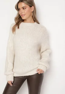 Jasnobeżowy Klasyczny Sweter z Wełną i Wiskozą o Luźnym Kroju Omethea