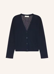 Drobna dzianina. Prosty krój. Dekolt w serek. Zapięcie na guziki. Rolowane zakończenia na rękawach. Prążkowane ściągacze przy rąbku. Półprzezroczysty materiał