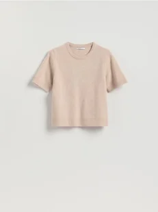 Sweter o prostym kroju, wykonany z wełnianej dzianiny.