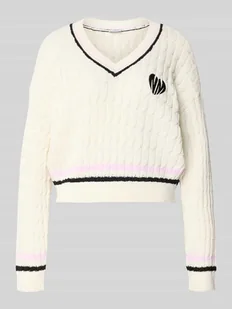Damski sweter dzianinowy marki Noisy May;mieszanka bawełny;krój regular fit;Model „MAKI”;ścieg warkoczowy;dekolt w serek;Długość tyłu w rozmiarze S: 50 cm;Długość rękawów w rozmiarze S: 55 cm