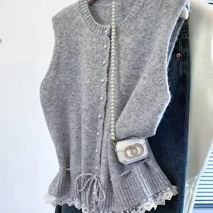 TEMU Elegancka Warstwowa Kardiganowa Płaszcza z Koronkowym Wykończeniem i Perłowymi Guzikami dla Kobiet
