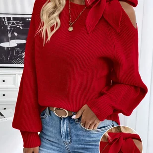 TEMU Elegancki damski sweter asymetryczny z kokardą - bluzka z długim rękawem i okrągłym dekoltem, czerwony sweter w jednolitym kolorze na zimę,