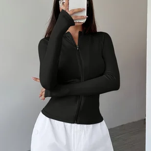 TEMU Elegancki kardigan damski z długim rękawem i zamkiem błyskawicznym - czarny, styl Y2K, okrągły dekolt, jednolity , stylowe detale z zamkiem