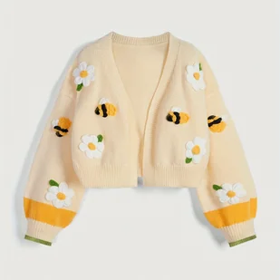 TEMU Tenggongchi Elegancki Nowy Kardigan z Haftem Kwiatów Pszczół, Sweter Płaszcz na Jesień i Zimę