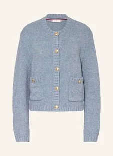 Dzianina strukturalna. Prosty krój. Okrągły dekolt. Zachodzące rękawy. Zapięcie za pomocą listwy guzikowej na całej długości.